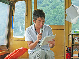 さて、第一回目の目的地は、磐越自動車道三川ICから「阿賀野川ライン舟下り」へ向かいました。毎日お客さんを相手に達人を展開している「トークの達人」に弟子入りする為です。