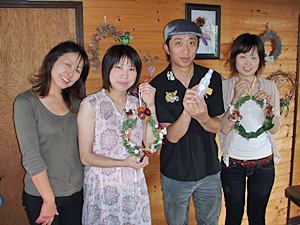 女子制作のリースですが、まず材料を畑から採ってくることから始めます。ハーブランドですから、その辺はお手の物。自分で選んだ材料で作れるってのも楽しいですよね。基本的な作り方は、最初にわっかの部分を作り、そこに装飾をしていくというもの。月桂樹やドライフラワーで飾り付けます。女子2名も真剣な面持ちで取り組みます。2人とも無言で黙々と手元に集中です。やっぱり夢中になっちゃうんだって!一時間程で完成!ハーブで出来たリースですから、こちらも部屋の中に置いておけば、癒し効果がありそうです。デザインもとってもよく出来ました。