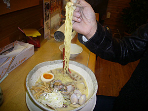 出来上がったあさり塩バターラーメンですが、見た目はホントにあさりバターにラーメンが入ってるって感じ。結構あさりも入っててボリュームもありますよ。まずはスープを一口・・・。これが文句無く美味い!!鶏がら、豚骨、和風等々ラーメンだしも色々ありますが、あさりだし恐るべし!!ホワイトシチューみたいな見た目からは想像のつかない濃厚さです。あさりをほぐして麺を一すすり、OH! MY新食感!なぜ我々はこれに気付かなかったんでしょうね。「これ流行りますね!」とご主人に言ったら、自身ありげな笑みを浮かべておりました。