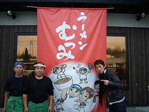 最後は、越後川口ICからこちらも10分、「ラーメンむつみ」。震災後立て直したという建物の前には、御主人夫妻の似顔絵入りノレンがかかっています。お店に入ると、思わず笑ってしまいそうな程ソックリのご主人が迎えてくれました。メニューも豊富で何を食べようかと悩むところです。ご主人にお薦めを聞いたところ、「あさり塩バターラーメン」ってのをお薦めしてもらいました。あさりバターにラーメン・・・?あうんかな?