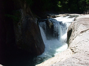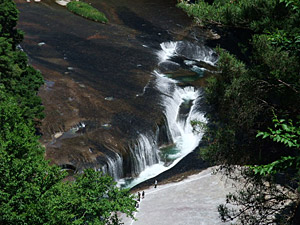 つり橋を渡りきると一気に川が近くなります。さっきまで断崖絶壁の上を歩いていたのに、こっちとあっちじゃえらい違いです。ほんの1m先が河原だもん。まばらだった散策者も、ここに来ると数を増します。歩きやすいし、なにより滝を眼前で見れるから、こっちに人が多いのは頷けますけどね・・・。上流から見る吹割りの滝ですが、あんなに広かった川幅が、いっきに10mくらいに狭まった所にあります。あたかも、大地を斧で割ったような裂け目に、ドンドン水が吸い込まれていきます。こりゃ~すげ~!!滝に注目していると、滝のすぐ目の前に人影が!あんな近くまで行けるんだ!?