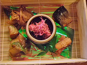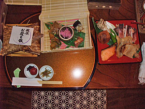 野菜やキノコなど、山の幸系は納得できるんだが、以外にも鮭やタラなど海の幸の品数も多い。一人に一つ小さな七輪様のものがもらえるんですが、そこで肉や魚を焼きながら食べるのがなんとも楽しい!昔の武士もこんな風に宴会を楽しんだのかしらね。