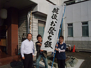 場所は「ホテル坂戸城」さん。ホント坂戸城の目の前!いきなり「越後お発ち飯」ののぼりが立っております。食堂に案内していただきまして、しばし社長さんにお話を伺いましたところ、当時の料理を出来る限り再現してみたとの事。う~ん楽しみだ!!