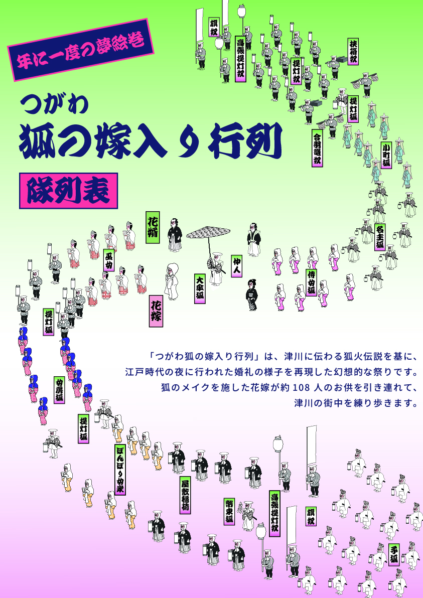 令和8年6月6日に開催する「第34回つがわ狐の嫁入り行列」の主役となる花嫁・花婿を募集します! 令和7年1月1日〜令和8...