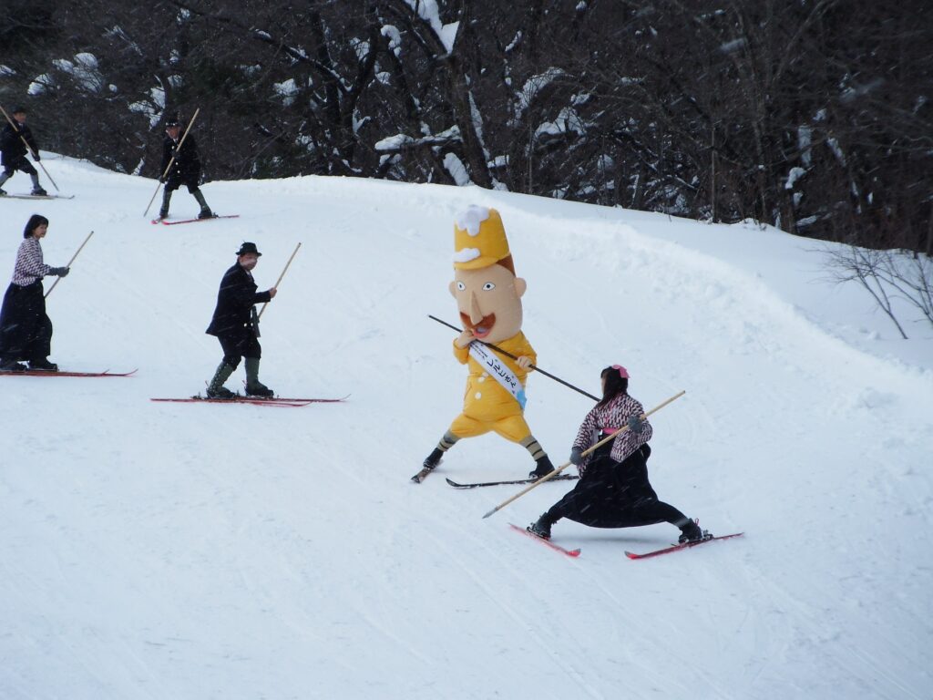 当時のスキーのスタイルを再現した一本杖スキーの披露をはじめ、