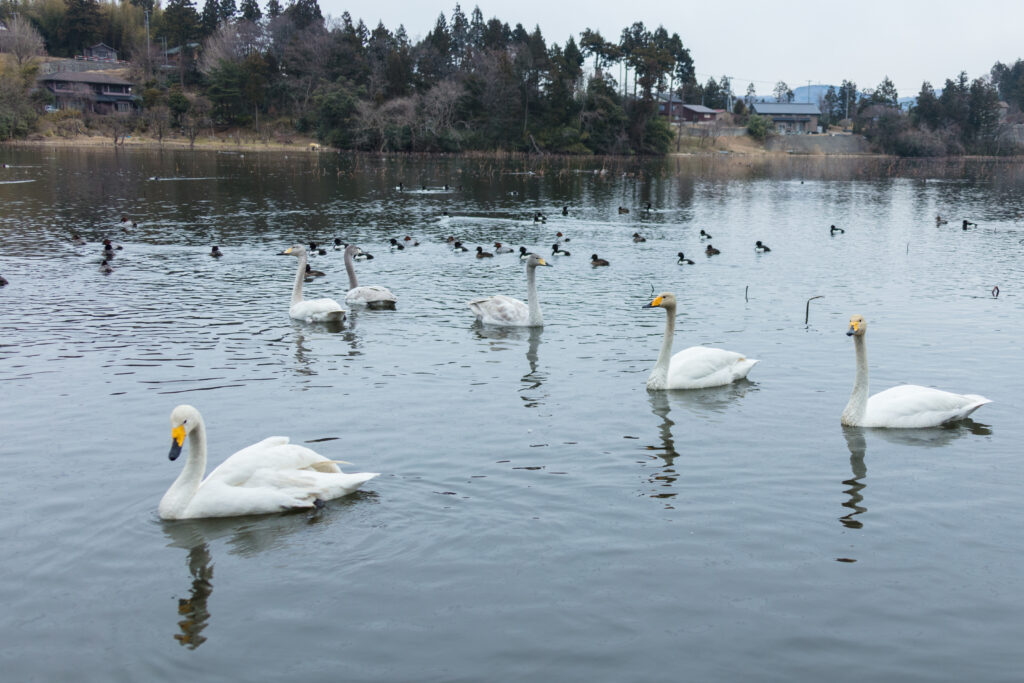 中でも、西山町の長嶺大池は、400羽以上の白鳥が越冬することで知られています。