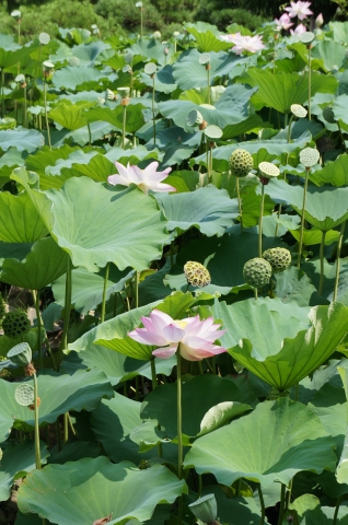 新潟市の白山神社では蓮の花がご覧のようでございます。神社の鳥居をくぐると、すぐに目に付く池一面に大きな葉っぱに大きなピン...