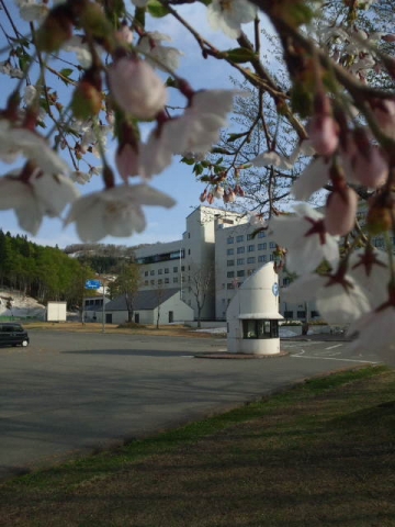 ニュー グリーンピア津南の桜が満開!敷地内の木々が緑の芽吹く中に見つけました。山を見渡したら残雪&緑の中に山桜の...