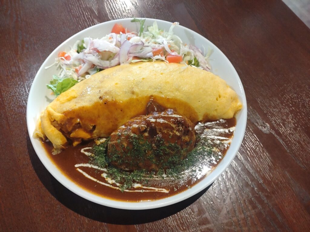 自家製デミソースがかかったオムライスに自家製ハンバーグとサラダ。