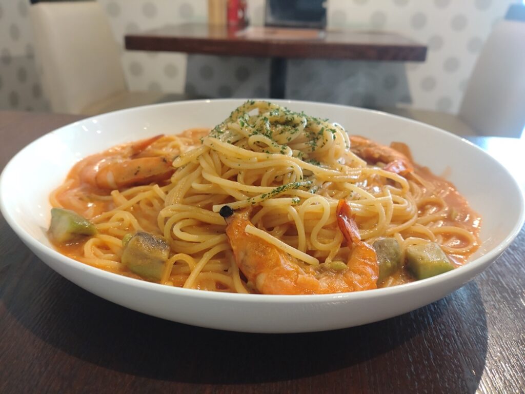 3品目は「エビとアボカドのトマトクリームパスタ」
