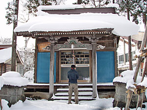 まずは、上信越道妙高高原ICから、「スキー神社」を目指します!結構噂は聞くんで、どんな所かと思ってたら、想像以上のこじんまりさ・・・。雪積もってんのに道はないわ、人が参った形跡もないわ、さらには予告して行ったのに、誰も来てくんないわで若干意気消沈。あんまり悔しいから番組ステッカー10枚程隠してきました。在り処が分かって持ち帰る方は、是非お参りして行って下さい。ヤンもしっかり安全祈願しておきましたよ!