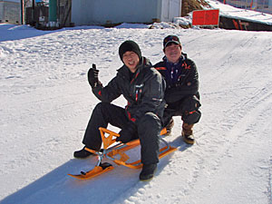 急な申し出にも関わらず、お付き合いいただいた田村さんと共に、まずは「スノーレーサー」に挑戦!スノーモービル型のハンドル付ソリなんですけど、ソリって事で侮るなかれ!コースが400mあるってのも理由ですが、相当おもろい!視点が低いから、スピード感あるし、コースのアップダウンが絶妙!皆でレースとかしたら盛り上がるよ~。