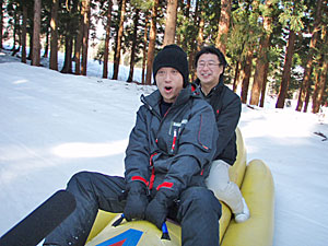 続いて、特別な日にしかやっていないという「雪上バナナボート」。ロケ日が晴天だったのと、広々とした専用コースで楽しめたので、気持ちいいのなんのって!南の島でやるのもいいけど、雪上ってのもおつですぜ!興奮して、営業担当S原氏なんて転落ですよ。久々に心から笑えた瞬間でした。次回はバレンタインデーにやるらしいよ。