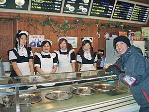 短い初滑りを楽しんだ後は、ちょいとした名物スポットへ・・・。ゲレンデ中腹にある「マウンテンレストラン」。ここには、今話題のメイドさんがいるのです!ただ、誤解のないように申し上げますと、皆さんが想像してるようなサービスはナッシングです。お店の制服が、たまたまメイド服だったと納得してください。でも・・・軽くテンション上がるよね。
