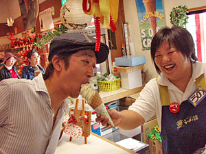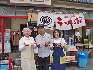 さぁ、ベロタクシーに揺られて到着は、今日の終着地「会津喜多方ラーメン館」です。ここは、全館ラーメン一色!おみやげのラーメンはもちろん、トッピングの具材に薬味、お菓子、グッズ等ラーメンにまつわる物で埋め尽くされております。施設内には、ラーメン工場もあって見学もできます。さすが、ラーメンの町!入り口付近の屋台では、こちらオリジナルのラーメンの無料試食だって出来ちゃいます。当然試食しちゃいましたけどね。おみやげだと思って馬鹿にしたもんじゃないよ!さすがこだわって作ったとあって、味もかなりの本格派。この味がお家で食べられたら、嬉しいですよ。我々もしっかり買って帰ったのでした。では、また来週!!