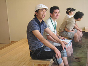 続いては、今回のリニューアル部分です。全部で5階ある「海ほたる」(実際にはもっとある・・・。)の4階「うきうき・ラウンジ」に到着です。なんとここには足湯があるんですよ!まぁ、温泉ではないんですけど、東京湾を一望しながら足湯に浸かるってのは、なかなか無いシチュエーションですよ。ドライバーの皆さんにも、ドライブの疲れが取れると好評だそうです。ちなみにこちらも無料。