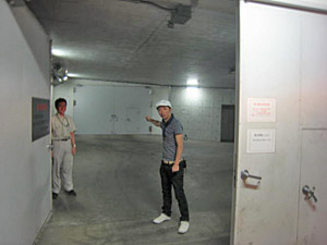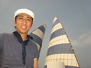 そしておまけ!案内人大武さんのご好意により、特別に「風の塔」に連れてってもらいました!「風の塔」ってのはアクアラインのトンネル部の海面に出ている、(簡単に言っちゃうと)巨大換気施設です。海の真中にぽっかり浮かぶヨットみたいな外観です。そこに、地下の秘密の通路を通っての潜入。我々が走ってきたトンネルの上半分が一般車用、下半分がこの秘密の通路なんですよ。万が一の事態には、この通路に避難するんですって。車に揺られながら、細い通路を約10分。いよいよ「風の塔」に到着です。扉を開けたら日光が半端じゃない!潮風と共に強烈な日光が我々を出迎えます。しばらく地下にいたもんで、5分は目をまともに開けられなかったっすよ。ようやく目にした「風の塔」は、壮観極まりない眺め!東京湾の真中にそびえ立つ巨大なツインタワーは、青と白とのコントラストも鮮やかに、悠々と海風をうけていました。単純にでかいもんに素直に感動してしまう男の子でありました。