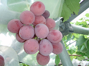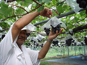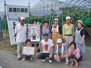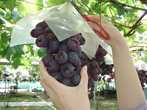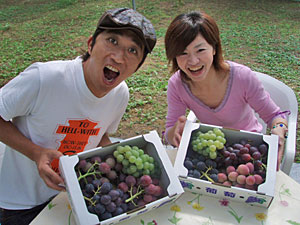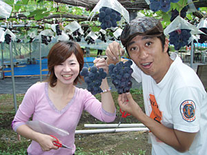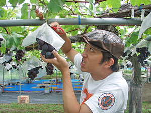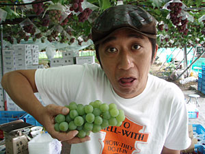 おじゃましたのは、聖籠観光ぶどう園の「高橋巨峰園」。聞くところによりますと、農家の方達が結集して、観光ぶどう園を運営しているそうです。全部の農園の面積を合わせると、新潟県最大の面積&品種数なんだって!案内人の高橋さんは、その中心的人物。聖籠的標準語をあやつるナイスガイであります! ぶどう狩りのシーズンは、だいたい9月、10月の2ヶ月位なんだそうですが、いろんな品種が楽しめるんだそうですよ。市場にはなかなか出回らない品種も多いって事で、期待も膨らみます。