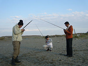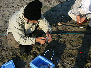 なんとか4人分の仕掛けをセットして、いよいよつり大会スタートです。ハゼ釣りは、ほんと簡単。そこらへんに投げておけば、黙ってても釣れてるって言っても良い位です。ヤンも一人20匹位は釣れるだろうと思っておりました・・・がっ!!この日はなんだか魚がいない!!