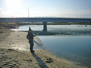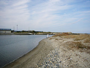 向かいましたのは、ファミリー向けのフィッシングスポットとしては定番の胎内川河口。日東道・中条ICをつかうと便利ですよ。ここは足場も良いんで、初めての釣りにはよい場所です。早朝の川面を渡る風が気持ちいい~。