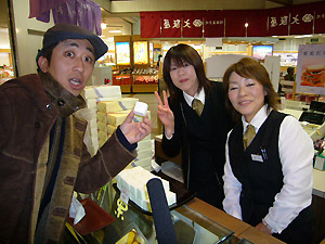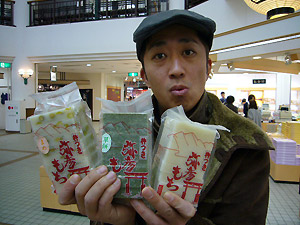 お店の数も、商品の数もハンパね~感じなので、ふるさと村のスタッフに、売れ筋商品を聞いてみることにしました。担当は、若干渡辺奈菜似の山ちゃんです。第3位・柿の種のチョコ味。第2位・安田ヨーグルトいちご味。第1位・新潟の地酒10本セットでした。お米とか笹だんごも上位に来るかと思いきや、そうでもないんですね。ただ、ヤン気ま的に売れ筋商品ばかりを紹介するのもいかがなものかって判断で、山ちゃんセレクトのおすすめを聞いたところ、「弥彦もち」はどう?って勧められました。今の既製品のお餅ってそうでもないけど、昔自分ちで作った餅って、すぐカビ生えたじゃん?あのカビの生えるお餅なんだそうです。そう聞くとあんまりいいイメージないけど、要は防腐剤が入ってない、昔ながらの美味しくて、安全なお餅って事です。じわじわ人気を呼んで、ヒット商品になりつつあるとか・・・。