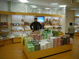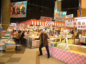 ふるさと村は、大きく「アピール館」「バザール館」に分かれているんですが、お土産は「バザール館」にございます。入り口入ると、中央にイベントが行われる広いスペース、右手が飲食コーナー、左手が銘店街、んで、その周りを取り囲むように様々なお土産が並んでます。奥に進むと、日本海の幸もおまかせの鮮魚センターまである始末。取材日も、県内外から沢山の人が訪れていました。