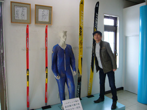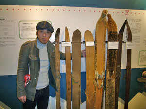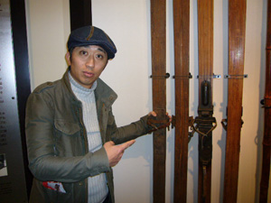 場所は、上信越道・上越高田ICから約5分。建物は山の上にあって、隣はすぐゲレンデ。反対側を見ると、上越市内を一望できるナイスビューです。中に入ると、まずは巨大な(等身大)レルヒさんがお出迎えです。写真を元に作られた像ですが、厳格な人柄まで伝わってきそうな迫力があります。展示物はなにもレルヒさん所縁の物ばかりって訳じゃなくて、スキーの歴史そのものも勉強できちゃいますよ。スキーって言うと、なんとなくヨーロッパのもの?みたいなイメージをもってましたけど、世界中で同時多発的に生まれたようです。どこぞの民族スキーなんて、板の裏に獣の皮を貼り付けてあったりして、なかなかに興味深い造形でした。