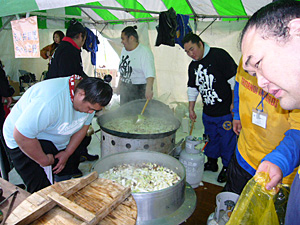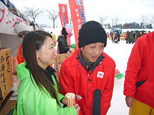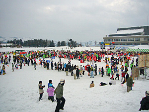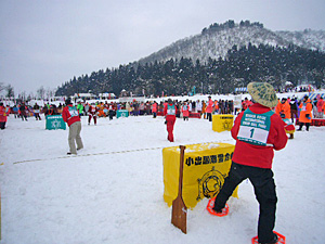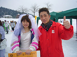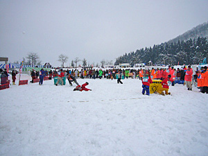 しかしながら、この大会スゴイのね。たかが雪合戦と侮るなかれ!県内外はもとより、遠く海外からの参加者も多く、20回目の今年の参加者は170チーム!ギャラリーも多数押し寄せ、朝からすさまじい程の熱気です。その熱気の一翼を担っていると思われるお相撲さん達の姿も見られます。なんでも毎年会場内でちゃんこを振舞ってくれているとの事。これがすごい人気で、長蛇の列が出来ておりましたよ。その他にも、地元の美味いもんが味わえる屋台が軒を連ね、これ目的で来ても充分楽しめると思います。そして、この大会のもう一つの人気の秘密が、選手たちのコスチューム。ウエディングドレスの女子集団はいるわ、半裸の男子が絶叫しているわ、なんじゃわからん謎の性別の集団がいるわで、見ているだけでも楽しい。選手のなかには、競技の成績よりもこっちの方がメインって感じの人いっぱいいたわ。