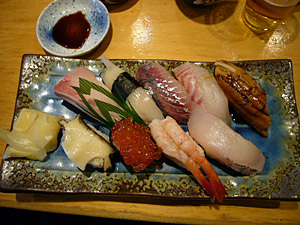 佐渡の味って言ったら、日本海の幸!事前リサーチによると、佐渡の寿司はハンパないらしいとの情報をGET!そりゃ~そうだよね、産地直送どころか港直送だもん。ならば、港に近けりゃ近いほど、食べる寿司も美味いんじゃ~ないかっていう手前勝手な論理で、小木港近くの「栄寿司」で腹ごしらえっす。ネタ元は、佐渡出身・新田アナ。どちらかと言うと、地元の人に人気のお店で、いいネタ出してるそうです。我々ヤン気まチームも、折角の佐渡だって事で、特上寿司をオーダー。これが、ハンパなく美味い!!特にブリ、イカ、アジなんかは、今まで食べた事ない美味さ!冷凍されないホントの味ってこうなんだ~。イカなんてプチプチって表現が適切な位、歯ざわりが良い&噛み切る時の音も快感。久々に寿司で感動しましたよ。それぞれ追加オーダーもあって、この日のランチは平均5000円也でした。ちょいと贅沢しすぎたかな?