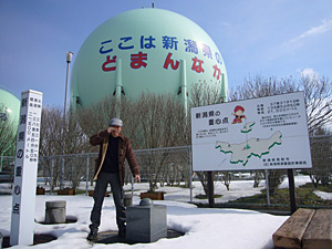 教えられた場所に行ってみると、あれれ???スケールちっちぇ!日本のヘソって、結構な名誉だと思うんですが、記念碑もちっちゃめ。公園なんて、6畳間位のもんですよ。もうちょっと大袈裟でもよかったんでないのかい?後ろにそびえる石油タンクの方が、目立ってしまうのはいたしかたない感じですわな~。