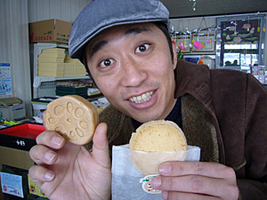 レンコン畑が連なる大口地区を抜けていくと、ありましたありました!押切駅前に「丸幸」が!入り口にはデカデカと「レンコン饅頭」って紙が貼ってあります。店内に入ると、饅頭どころじゃない!サブレはあるわ、羊羹はあるわ、よく喋るおか~ちゃんはいるわで、さしずめレンコンパラダイスであります。(おか~ちゃんは関係ね~か・・・。)それぞれ試食させてもらったんですけど、ちゃんとレンコンが主張してましたよ。食感はやや芋に近いものの、あの独特の「シャリッ」って感覚は健在。味自体は、栗と比べても遜色ない程、お菓子にマッチしておりました。う~んお見事!