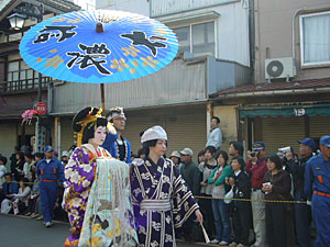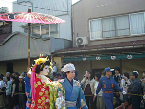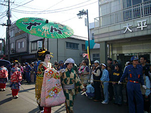 さて、いよいよお時間参りまして、おいらん道中が始まります。きらびやかに着飾ったおいらんの方三名が、沢山のお供を従えて町のメインストリートを練り歩きます。見てる方は「綺麗だな~」なんて漠然と思っておりますが、実際歩いてるおいらんさんは超大変!かつらやら衣装やらの重さを全て合わせると、30kgもあるんですって!しかも、おいらんの皆さんの歩き方には作法があって、8の字を描くように歩く特殊な歩様が要求されます。まぁ、その所作が優雅であるわけですが、実際やってる人は体力勝負なんだろうな~なんて思ってしまいました。