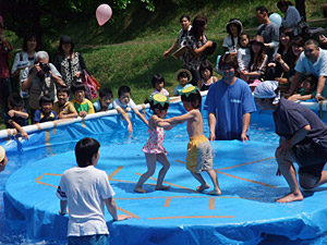 最初に見に行ったのが「かっぱ相撲大会」大きなプールに浮かべられた特設土俵で、ちびっ子達が真剣勝負です。さすがにっかっぱ相撲だけあって、特別ルール採用です。まず土俵上で転んだり、手をついても負けではありません。勝敗は水に落ちるか、泣いてしまったり戦意喪失した場合に限ります。必然的に長い勝負も多くなってくるわけですが、そうなっちゃうとギャラリーの親御さんも当然ヒートアップしちゃいますよね。