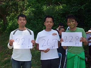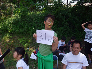 気合を入れなおして第二投!今度は若干角度が悪い。ふわ~っと上がったと思ったら、こともあろうに戻ってきちゃった!・・・記録22m。結果は中途半端な準優勝でした。詰めが甘い!