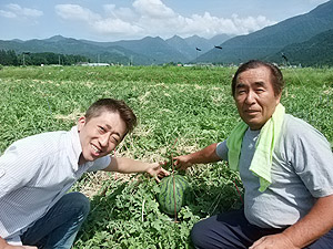 まずは、関越道・大和PA スマートICを降りて、田園部を走る事たった5分。一軒の農家に到着です。飯塚農園の飯塚さんのお宅であります。この地域は、古くから八色地区と呼ばれていて、うまいもんの産地として全国的にも有名です。八色でピーンときた方は、アンテナの感度がいいね。そう!最初に紹介するのは「八色スイカ」なんですわ。