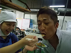 坂詰専務の案内で、まずは工場見学から。みなさん知ってた?納豆ってさ、まず納豆を作ってからパックするもんと思ってませんでした?違うのよ。茹でた納豆に、納豆菌をかけて、まずパックしたうえで発酵させるんですと!だからみなさんご存知のあのケースに入ったまんま、豆が納豆に変身するんですって~・・・など目から鱗を落としつつの工場見学です。地元の小学生の社会科見学のコースになっているのも納得納豆です。