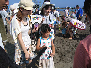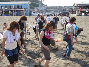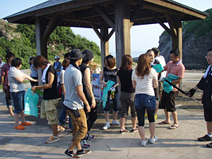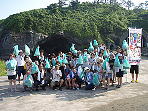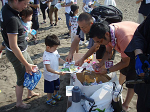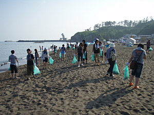 集合場所は、北陸道・柏崎ICから15分、鯨波海水浴場であります。朝も早よから、駐車場には県外ナンバーがずらり。さすが新潟有数の海水浴場です。我々6時くらいからスタンバイしていたんですが、7時半位には40人程の参加者が集まってくれました。ありがたい話です。親子連れにカップルに仲良し集団などなど、多彩なメンバーがゴミ拾いです。(遅刻者数名・・・。)