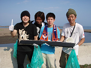 さて、1時間ほどみなさんで海岸清掃したその成果ですが、かなりの量が集まりましたよ。吸殻やビニールゴミ中心ですが、中にはボートの破片や古タイヤを見つけた人もいたりして、軽トラック一台分ほどの収穫。いや~みなさん頑張りました!スタッフはもとより、海を愛する皆さん全員が、参加諸君に感謝であります。また機会があったら是非よろしく!!