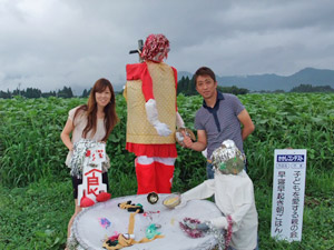 今週はなんと!情報提供者のおかぴーが、同行キボンヌとの事で、軽くデートっぽく楽しんでみたいと思います。まず駐車場に着くと、そこここに案山子がズラリ!津南の皆さん制作のオリジナル案山子なんだそうですが、秀作、珍品多数でなかなか面白いですよ。