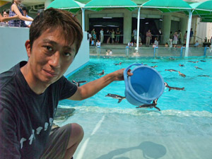 あの起立の姿勢のアザラシですよ!なんと今回は、そのジョーの餌付けをさせてもらっちゃいました。ヤン的にはてっきり、マスコミパワーでコソコソってやらしてもらえるんだと思ってたら、いきなりの客前。ショー形式での餌付け体験です。