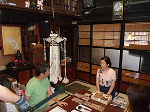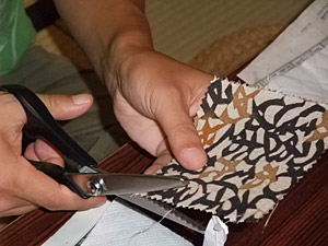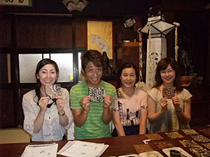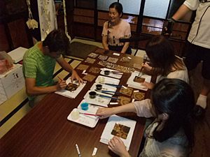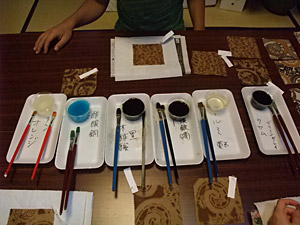 まずは予め用意されている台紙に、染料で色を付けていきます。台紙は複数のパターンがあるので、自分好みのデザインを選んでください。色ののせ方もお好みで・・・。ヤンもおかみさんのご指導のもと、いろは柄に挑戦。染料は染め上がりの色と違うので、頭の中で出来上がりをイメージしながら作業を進めます。これが意外に難しくもあり楽しくもある。うんうん唸りながら15分ほどかけて塗りあげました。