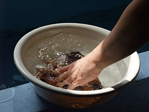 しかる後、今度は洗い場に移動。今ほどの台紙をきれいに洗います。台紙には、染めない部分におがくず(?)みたいなのが付いているんで、そいつを洗い流すのです。ヘラみたいなやつでゴリっと取っちゃいます。あとは乾かして、ほつれを直して完成であります!所要時間40分位でしょうかね。小学生や幼稚園児でも出来る内容だそうなので、家族でやってみても楽しいかも。