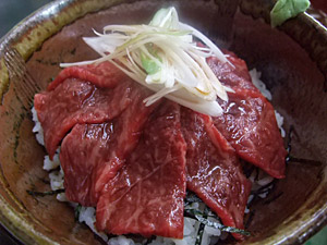 秀作に気を良くしてのお昼ごはんですが、ちょいと奮発!特選村上牛にしてみました。村上牛の専門店「やま信」さんで、牛さし丼をいただきます。本業はお肉屋さんなのですが、店内でおいしい村上牛メニューをいただけます。ここんちの若社長は、ヤンと夜な夜な遊びまわったポン友なので、村上牛のコロッケなんぞをサービスしてもらいながら、至福のひとときを過ごしました。やっぱメッチャ美味い!作ってから30分以内に食べないと、この美味しさが味わえないので要注意ですが、テイクアウトも出来るんで、是非みなさんにもお勧めしておきたいっす。1800円と若干贅沢ですが、それくらいの価値は充分にありますよ!!