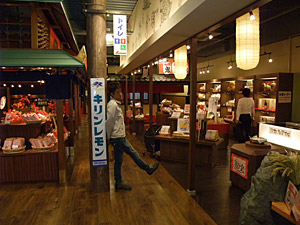 外観はなんとなく歌舞伎小屋の風情。役者の看板みたいなのが屋根の上に飾られてます。建物自体も大きくて、堂々とした佇まいっす。自動ドアを抜けて中に入ると、もうそこは別世界!建物の中に町がある!案内人の山口嬢のご説明によりますと、横丁をイメージしているのだそうな。うんうん、なんか懐かしい感じの町並みです。三丁目の夕日をイメージしていただくと良いかもです。