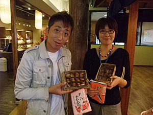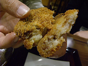 館内には飲食スペースもあって、ここにも奇食メニューが・・・。「ぬれ鬼コロッケ」これいかに?コロッケの中にぬれおかきとジャガイモが入っているんだそうな。一体全体どういうお味なんでしょうか?!早速試食です。うむむ!なんじゃ~、こりゃ~!!の新食感ですわ!なんでジャガイモとおかきでこうなるのってモチモチ感。多分みなさんが想像してるモチモチの限度を超えてますぜこれは!もはやお餅の方に近い食感かも。でも風味はしっかりおかきにジャガイモ。なんとも不思議な逸品です。なおかつこれが旨いのだからさらにビックリです。近くの席でこのコロッケを食べていたレイディース二人も絶賛していましたよ。ヤン気まスタッフは、むしろレイディース二人の美貌を絶賛していましたけどね・・・。