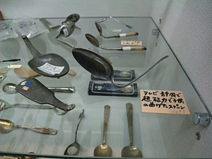 と斉藤氏が自慢するだけの迫力であります。貴族がティータイムに使ったと思われる、ステンドグラスみたいなスプーンや、芸術作品のようなシャープなラインのスプーンなんかは、見てても「ほほ~・・・。」なんて溜息も出るのですが、昔アイス買うと貰えた「木のさじ」まで展示してあるのはいかがなものか?あのロッテとかエスキモーとか書いてあるやつですよ。さらにはどこぞの地方局の番組で、名も知らぬ少年が超能力で曲げたスプーンも展示してあって、もはやスプーンなら何でもあり状態!!うむむむむ、マニアの世界は深いの~~~~。