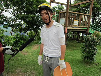 なので、滑る際は完全防備!軍手をはめて、ヘルメットをかぶって、専用の敷物(?)の乗って、正しいフォームで滑走しなければなりません!!この正しいフォームってのが結構大事!思いのほかスピードが出るので、滑り台の壁に体があたるとやけどしちゃうのよ!!